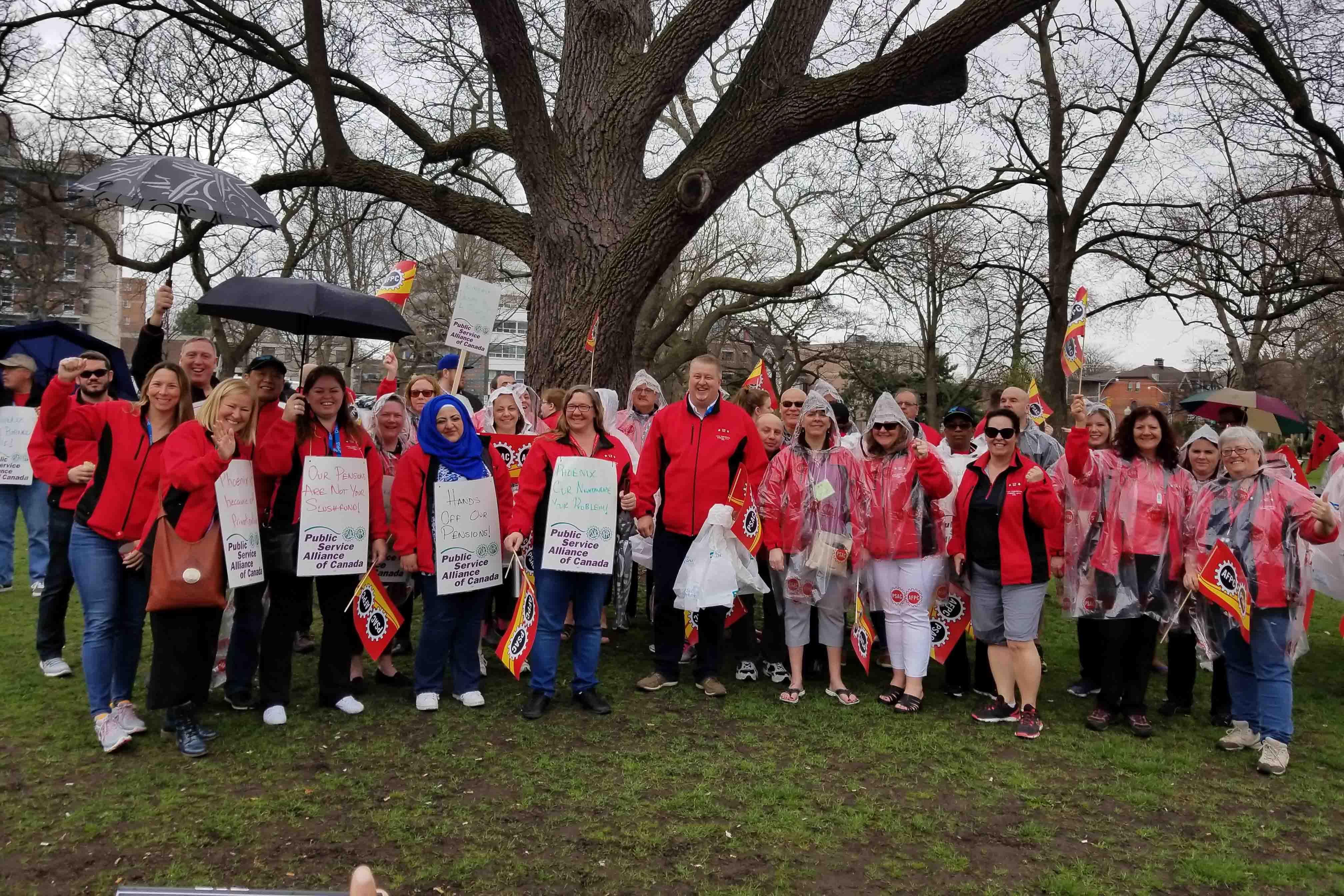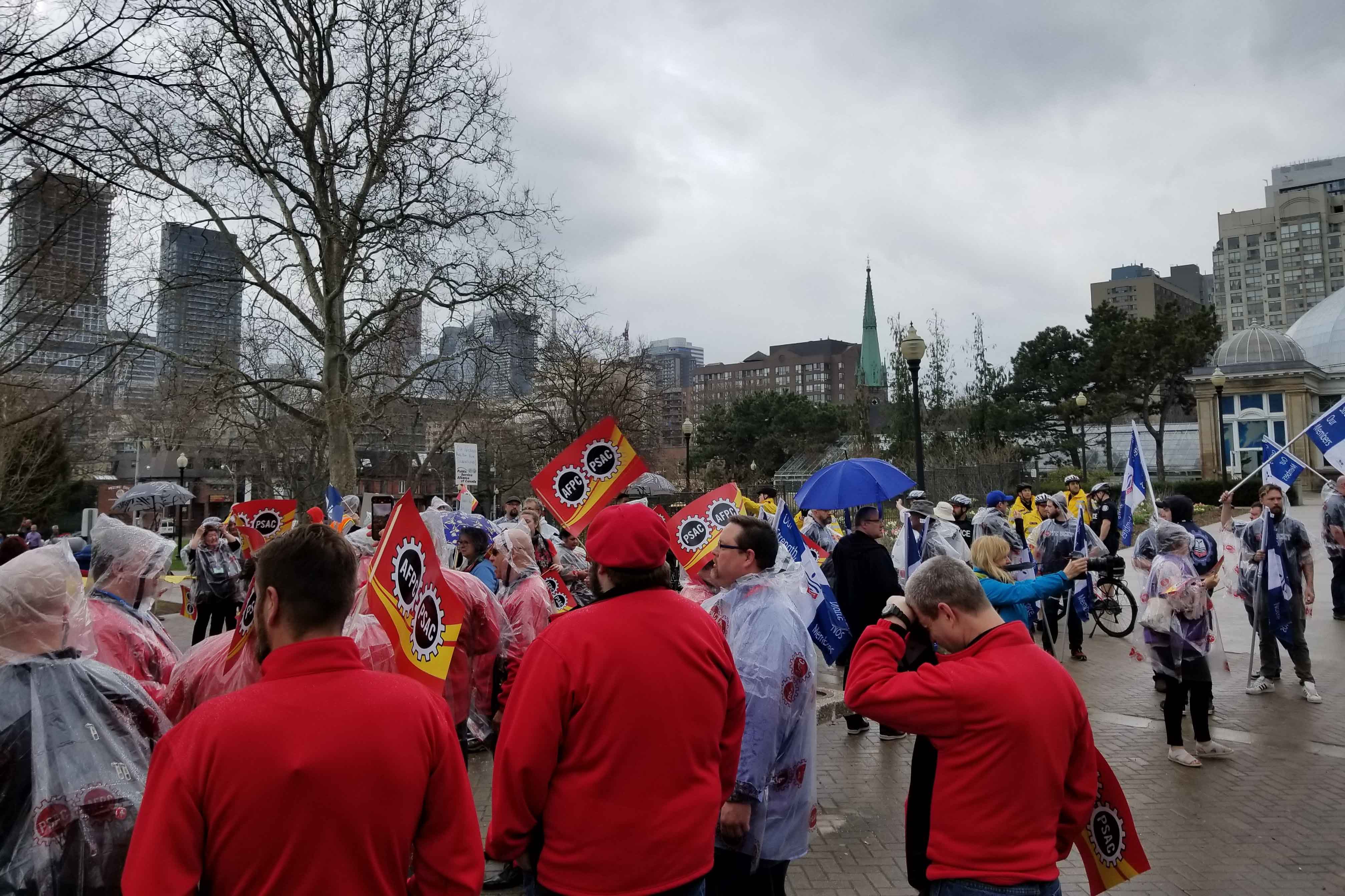 Marching to Bill Morneau's office to demand that the Liberal government take action to pay their employees properly and on time